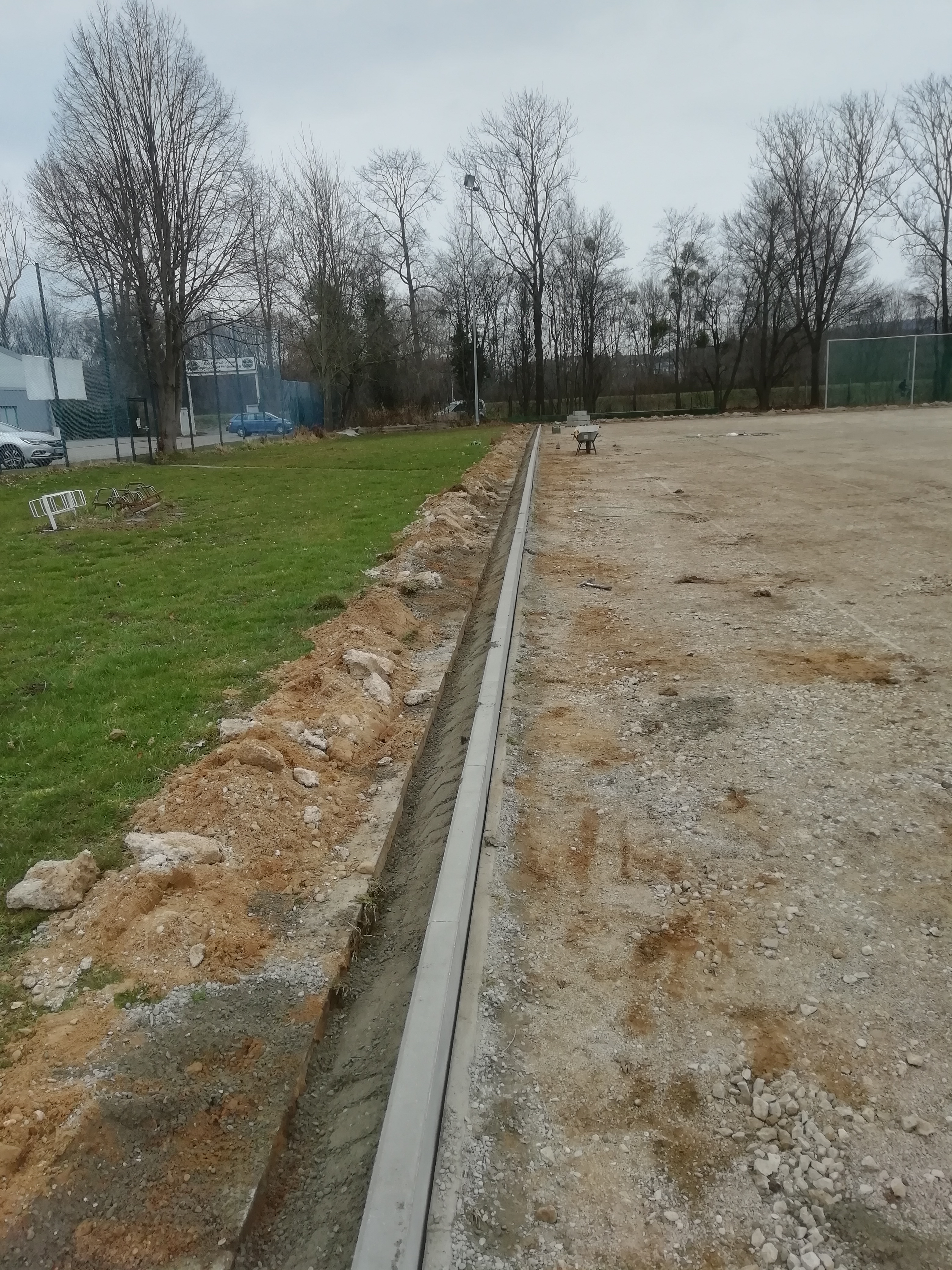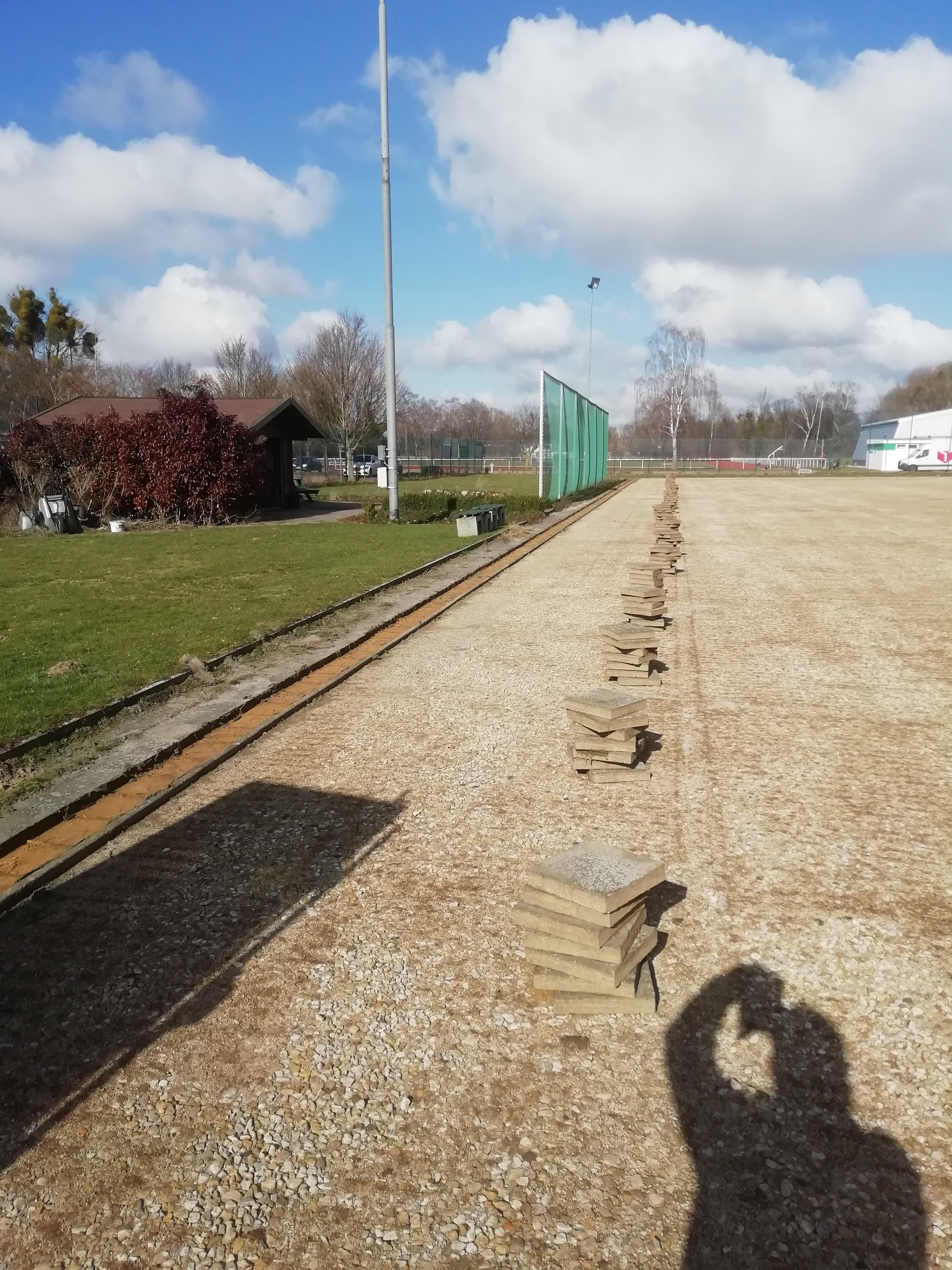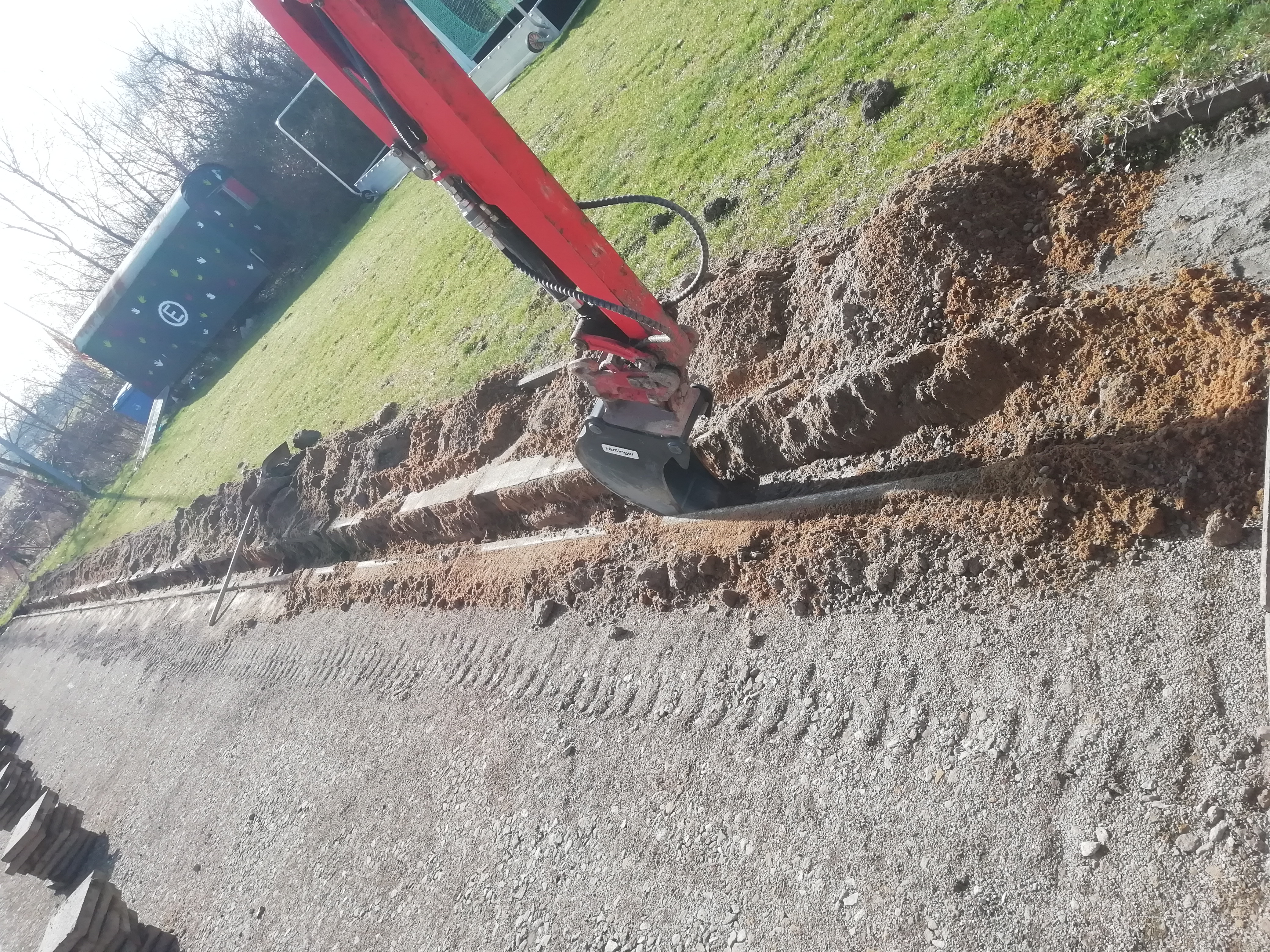 Da für das Setzen der Bordsteinkanten auch ein Teil der alten Umrandung aus Gehwegplatten weichen musste, haben wir uns hier noch für eine kurzfristige Planänderung entschieden. Statt die Platten geschnitten wieder einzusetzen, hat Fa. Straßer die insgesamt rund 300m² vollständig entfernt und für uns gesammelt. Mit den Platten können wir jetzt andere Projekte, beispielsweise eine größere, stabile und saubere Standfläche für Fahrräder, realisieren. Für eine bessere Versickerung von Oberflächenwasser, zur Verminderung der Verletzung Gefahr und als "Bremsbereich" für flache Bälle, wird die Lücke zwischen Bordsteinkante und alten Rasenkanten mit Kies aufgefüllt.