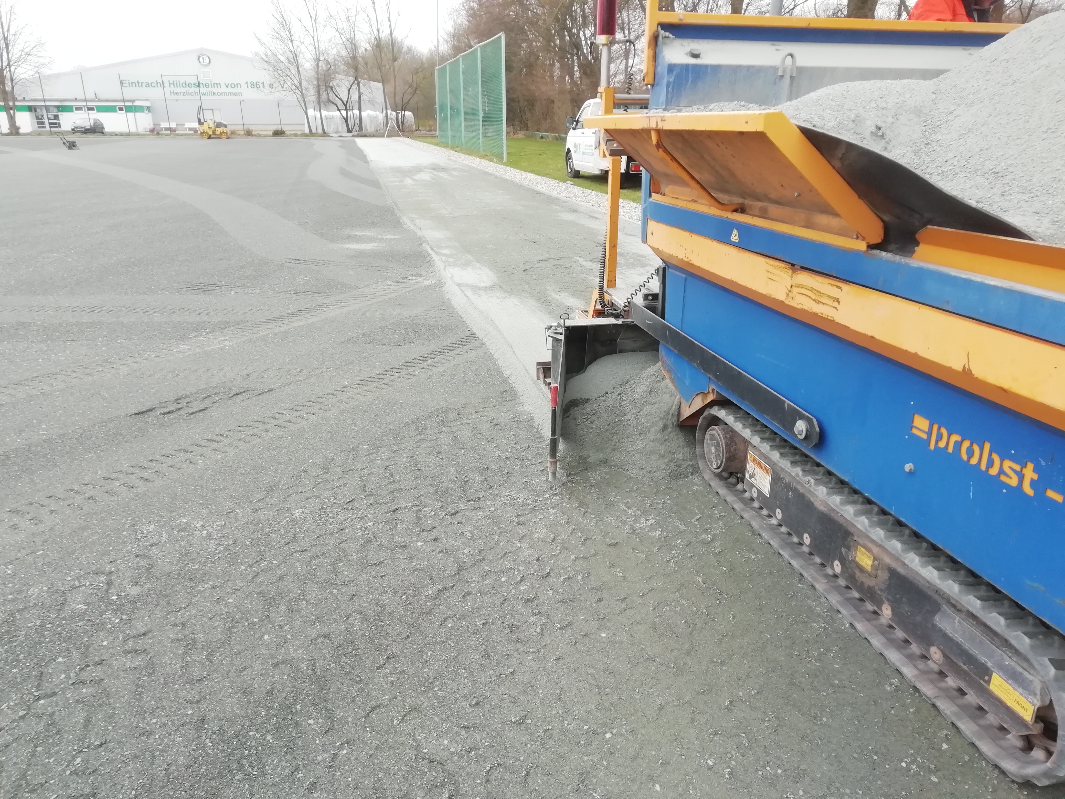 Trotz der eisigen Temperaturen und des Schnees Anfang April wird fleißig weiter gearbeitet. Nachdem die Spielfeldumrandung gefestigt wurde, ging es weiter mit dem Spielbelag. Denn die erste Schicht von vielen steht schon und wird gerade festgefahren und gewalzt. Noch ist die Fläche, passend zum heutigen Wetter grau, doch es wird nicht mehr so lange dauern bis unser Platz in einem neuen Grün erstrahlt! Wer freut sich denn auch den Platz wieder zu bespielen?