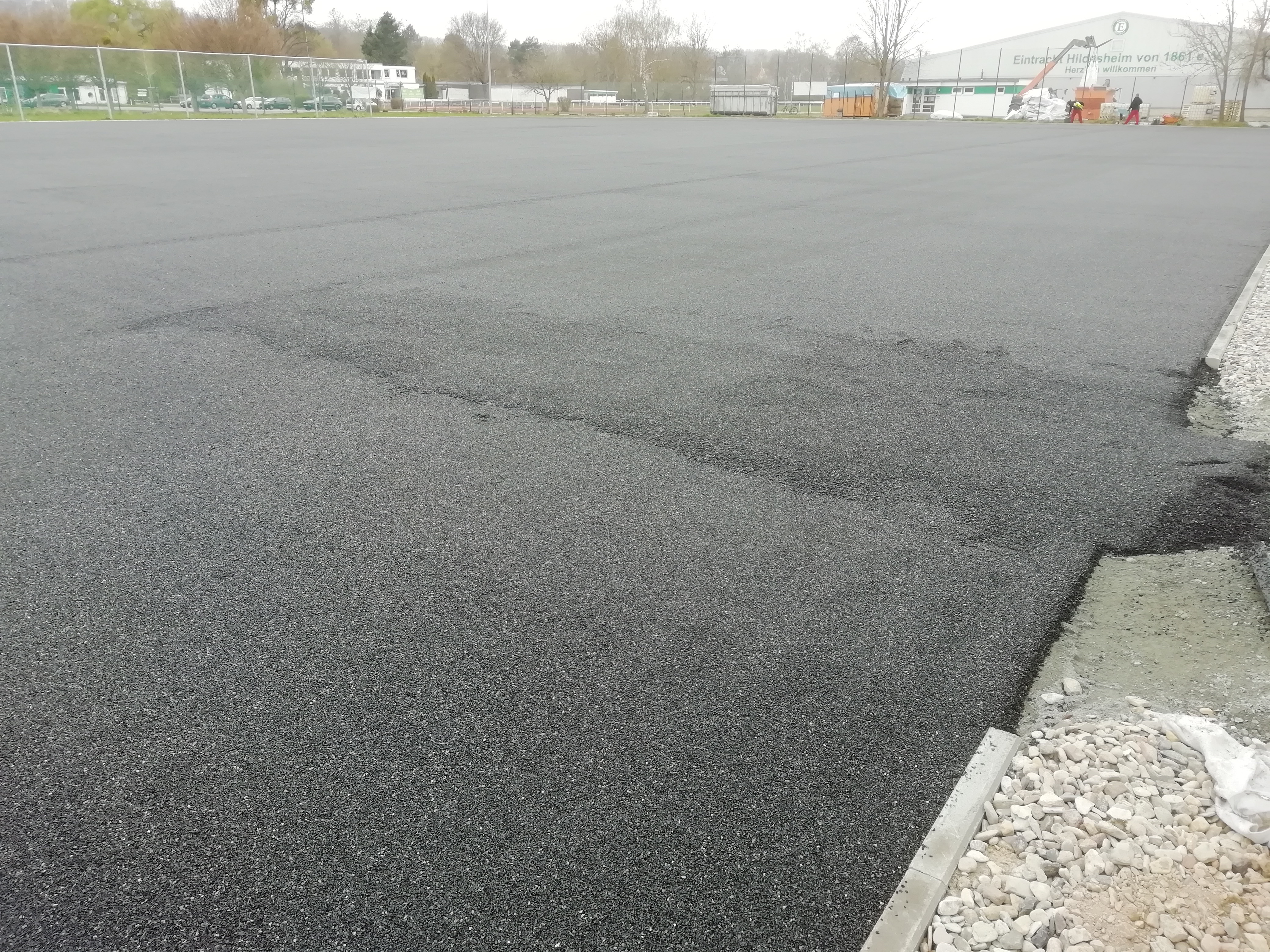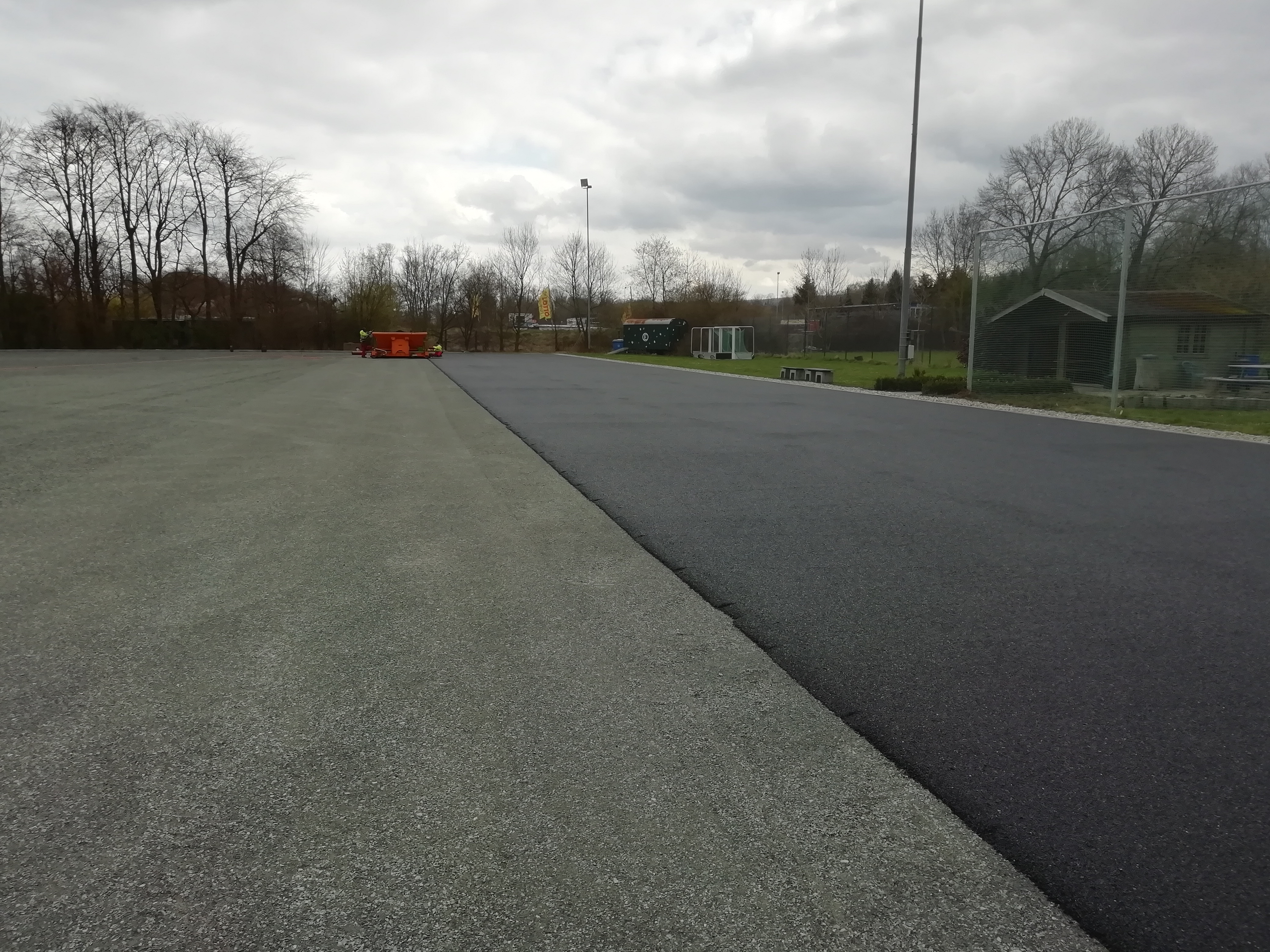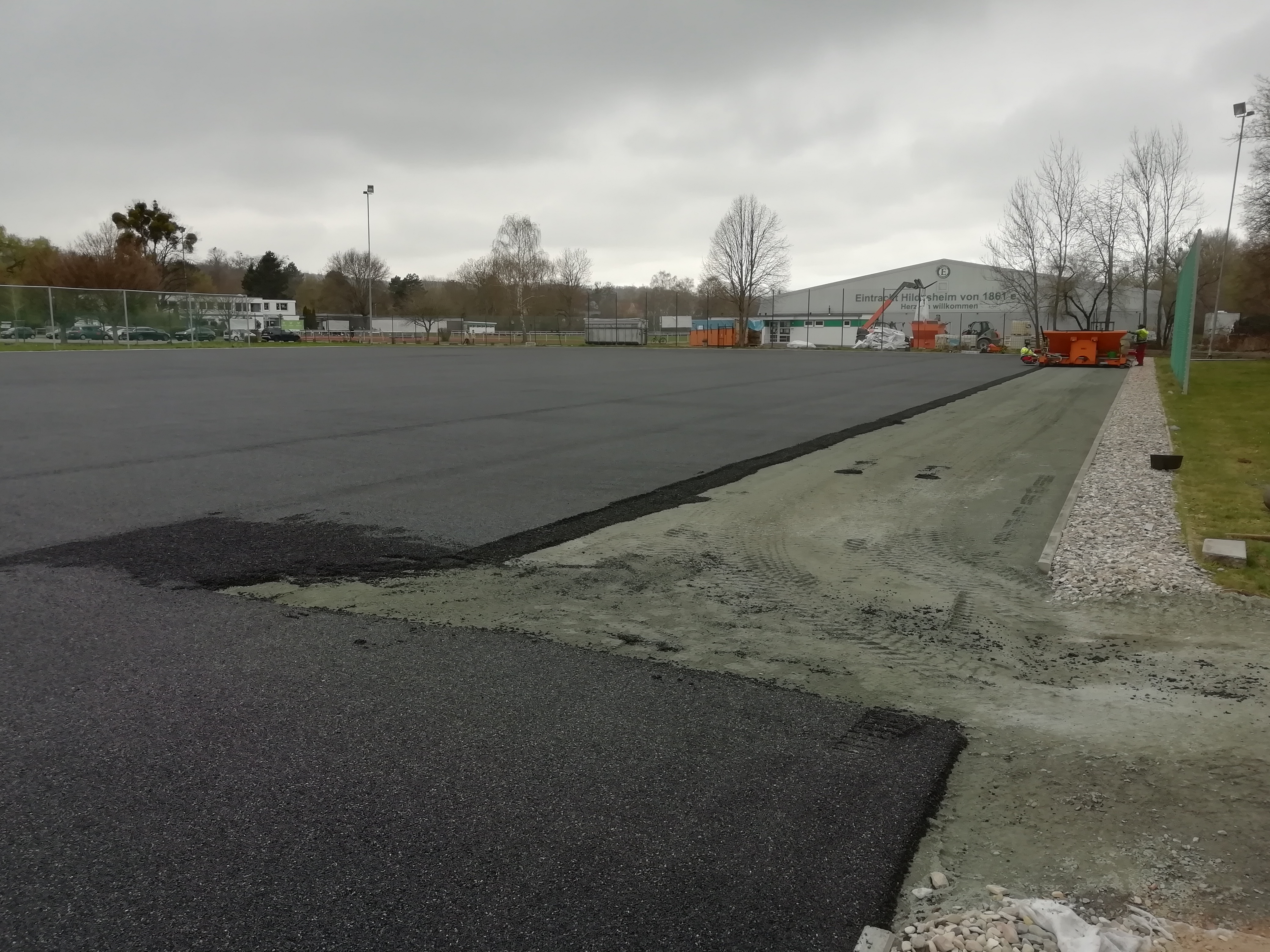 Dazu braucht es vorallem eine ganze Menge Gummigranaulat, das in den weißen BigBags angeliefert wurde. Für die Fläche von 6.000m² unseres Platzes braucht es mehrere LKW Ladungen. Für die fertige Tragschicht wird das Gummigranulat mit feinem Kies und einem Bindemittel vermischt und anschließend mit einer Spezialmaschine auf der Fläche verteilt. Diese sorgt auch dafür, dass die Elastikschicht am Ende genau die 35mm stark ist, die wir für unseren Platz benötigen. Neben dem neuen Belag ist diese Tragschicht auch die wichtigste Veränderung zu unserem alten Platz und wir sind gespannt, ob ihr den Unterschied in Zukunft auch merken werdet!